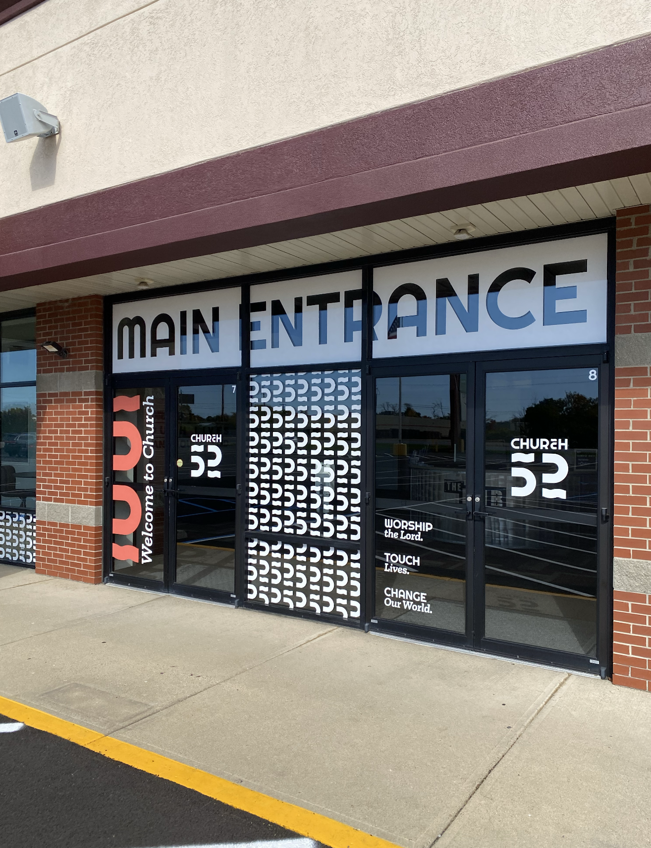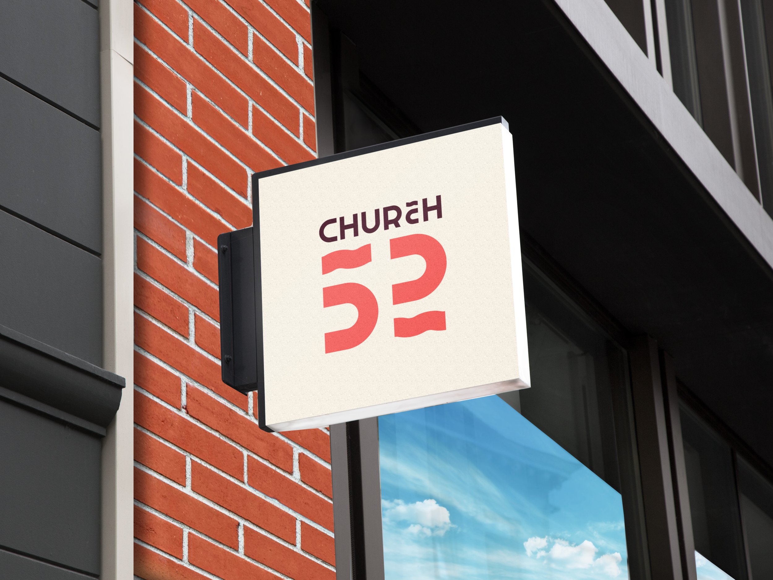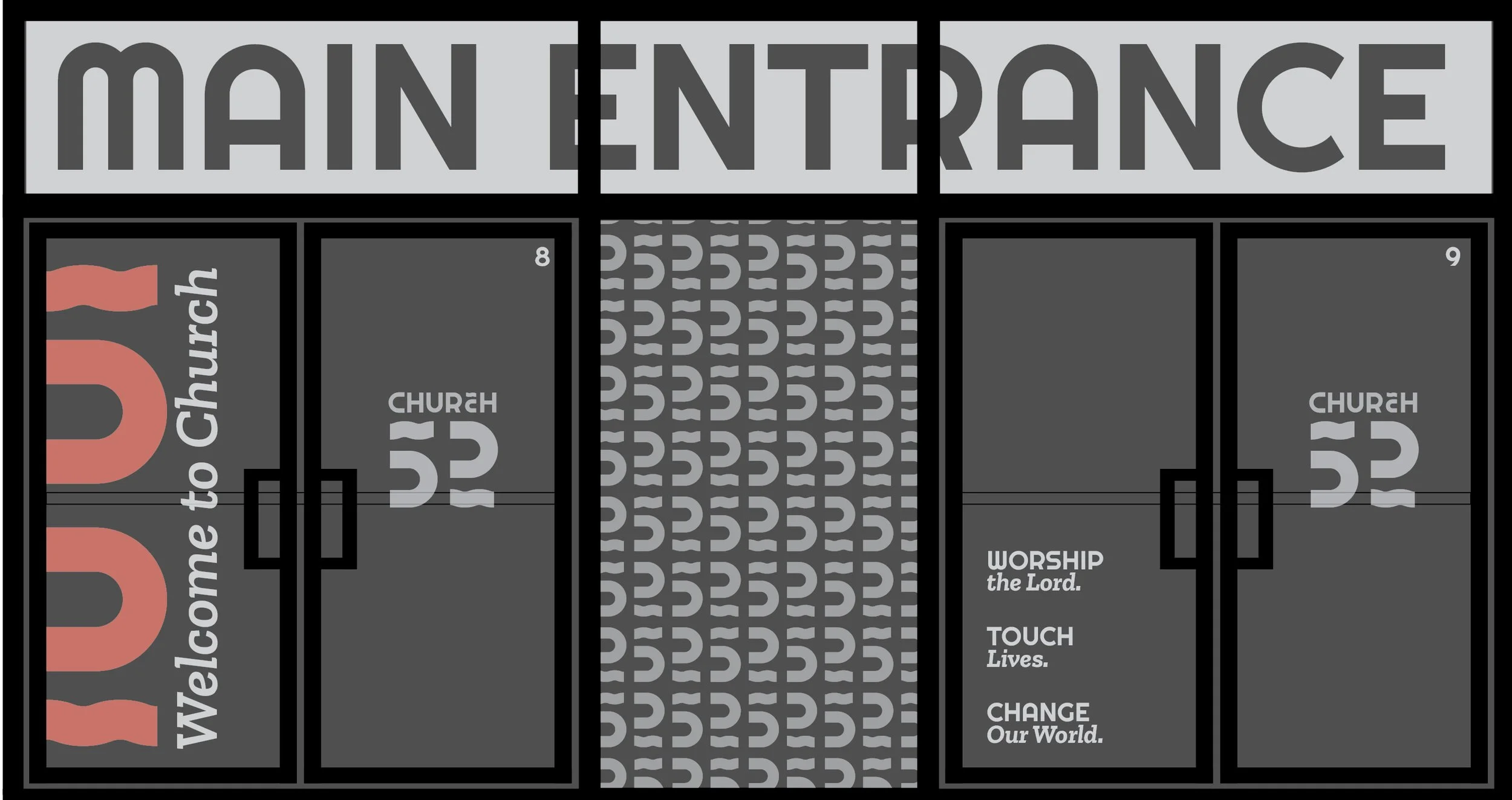 The final identity presents Church 52 as a church expectant—rooted in the Spirit’s leading and energized by its calling to share good news. The custom typography carries layered meaning, with flowing lines above the “C” and within the numbers 5 and 2 referencing the tongues of fire at Pentecost and a flag lifted in the wind, echoing Isaiah 52. These same forms suggest movement, worship, and proclamation. The number 2 can also be interpreted as a figure kneeling in worship, while the pairing of 5 and 2 recalls the miracle of the loaves and fish—an image of multiplication that mirrors Church 52’s vision for expanding impact and outreach. To ensure flexibility, Marion Design Co. developed four logo variations alongside supporting icons, secondary marks, and patterns. A bold color palette anchors the system, with red and burgundy expressing passion and spiritual energy, balanced by cooler secondary tones that convey welcome and calm guidance. The brand was applied across digital and print materials and extended into interior and exterior wayfinding and facade design, helping establish Church 52’s building as a permanent, recognizable home for its growing community.