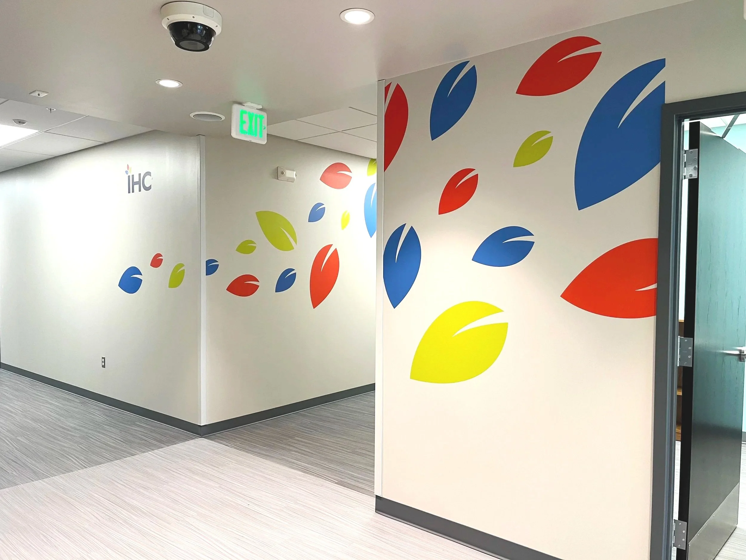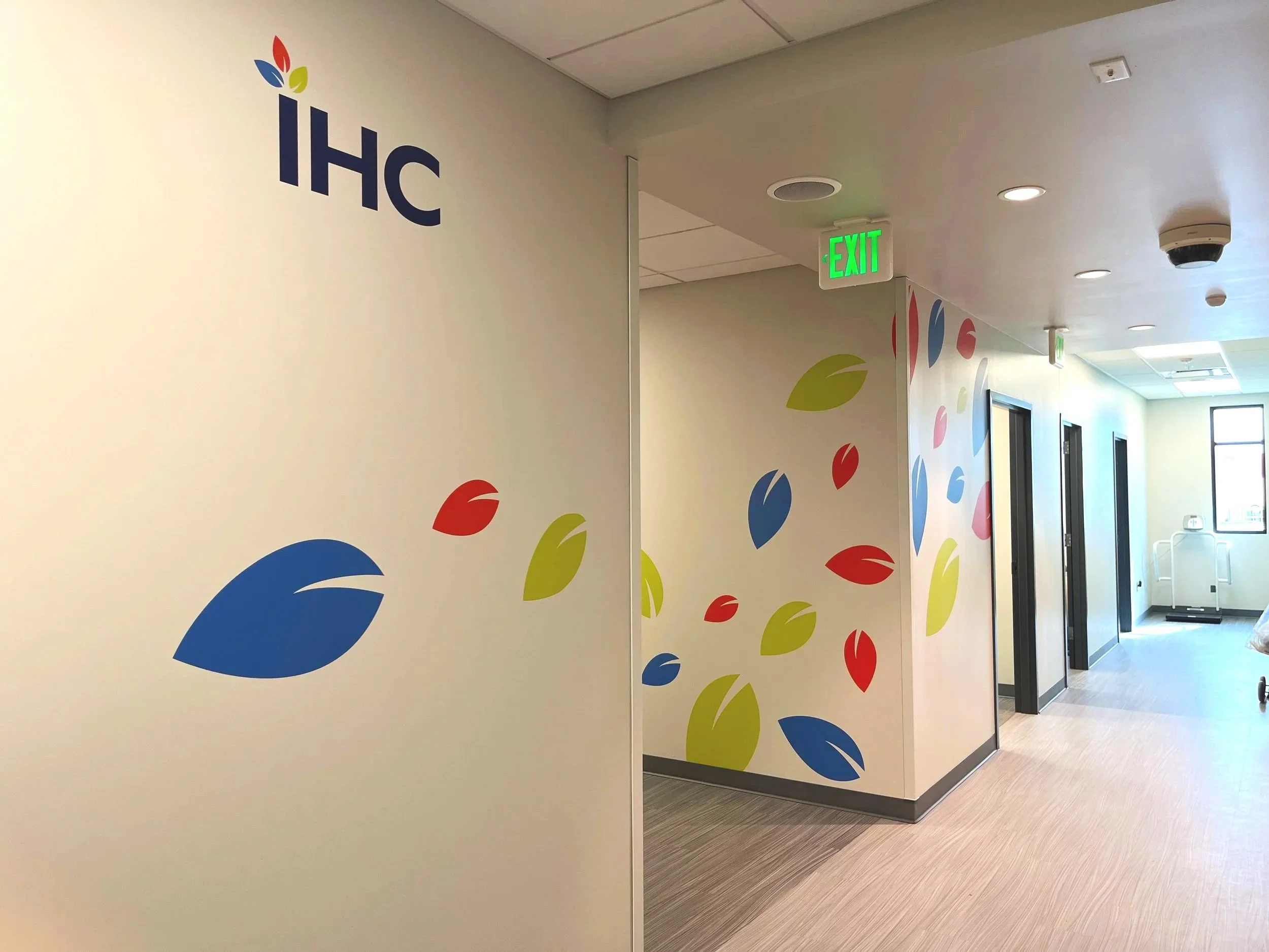 Halstead Architects connected Marion Design Co. with the IHC Bedford location, which was seeking to increase visibility by installing murals on their exterior office facade windows. They already have a functional brand system, but they were looking to further incorporate and develop the system in a more engaging way. After completion of the Bedford exterior windows, IHC approached Marion Design Co. a second time to create an interior mural for their new Marion location.