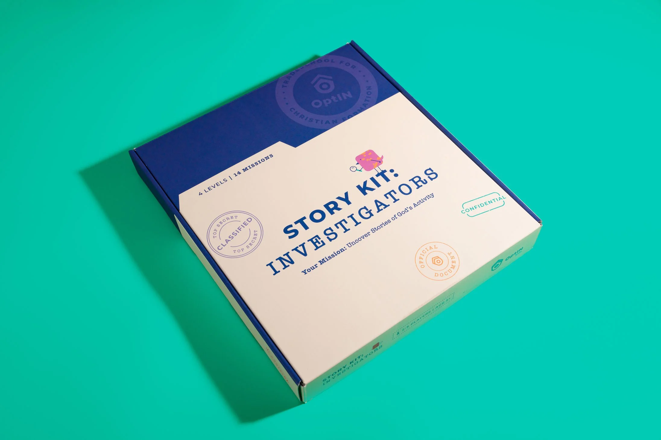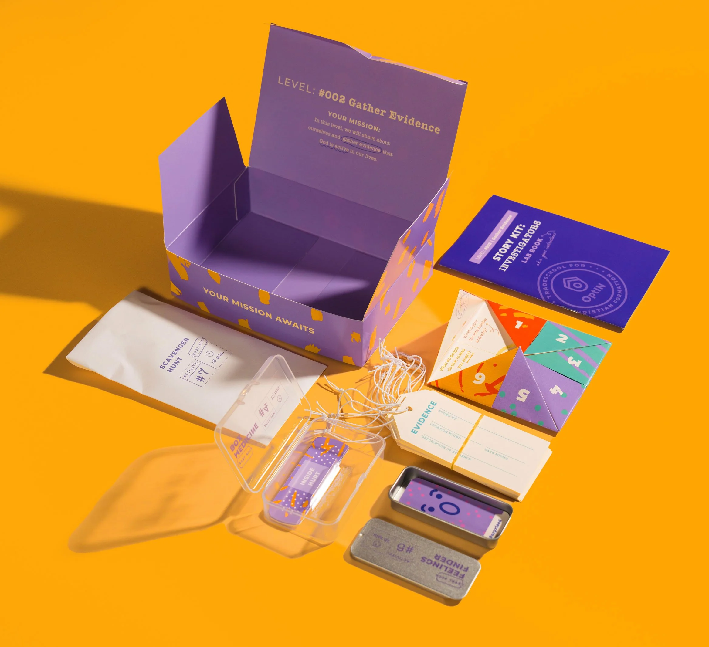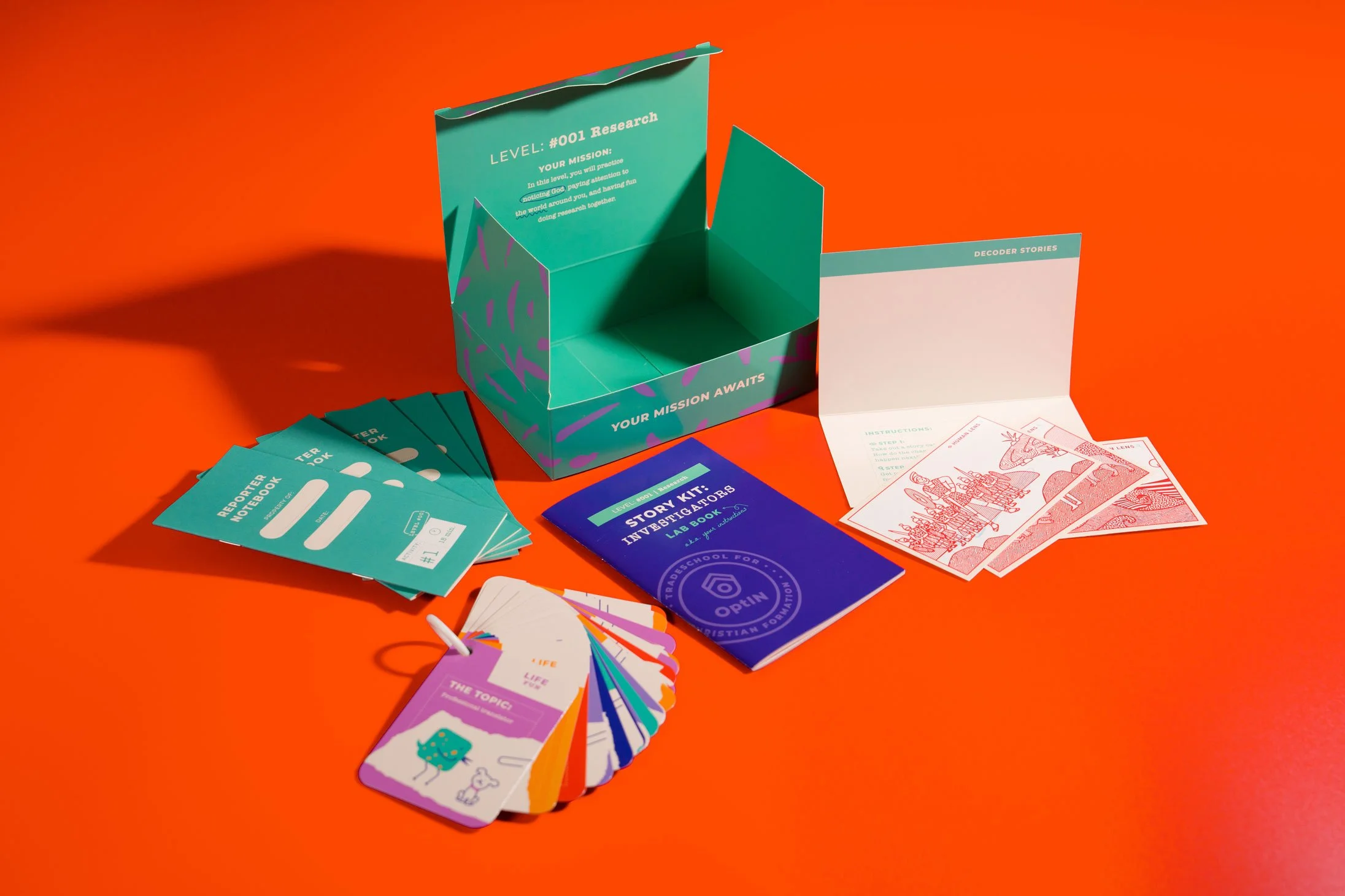 A key brand element—the custom bird characters we previously developed for OptIN—was integrated throughout the kit, appearing in illustrations and activities to encourage play, storytelling, and connection to everyday life. To reinforce the “Investigator” theme, we developed unique tools such as a decoding lens, reporter notebooks, evidence tags, case files, and interview clipboards. Custom illustrations of Bible stories and characters further enriched the experience, making theological content engaging while prompting conversation and reflection.