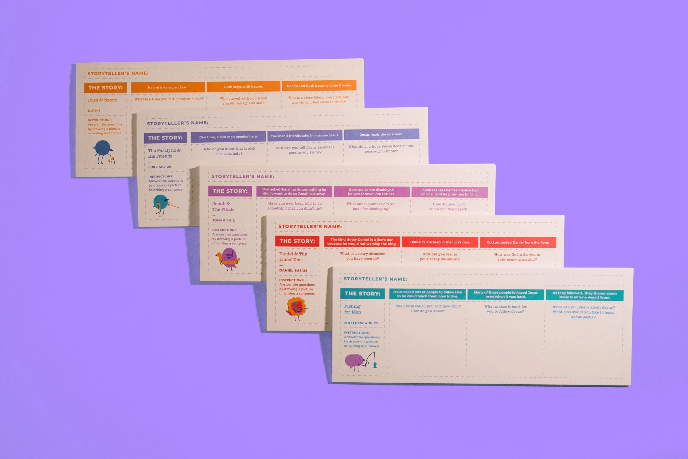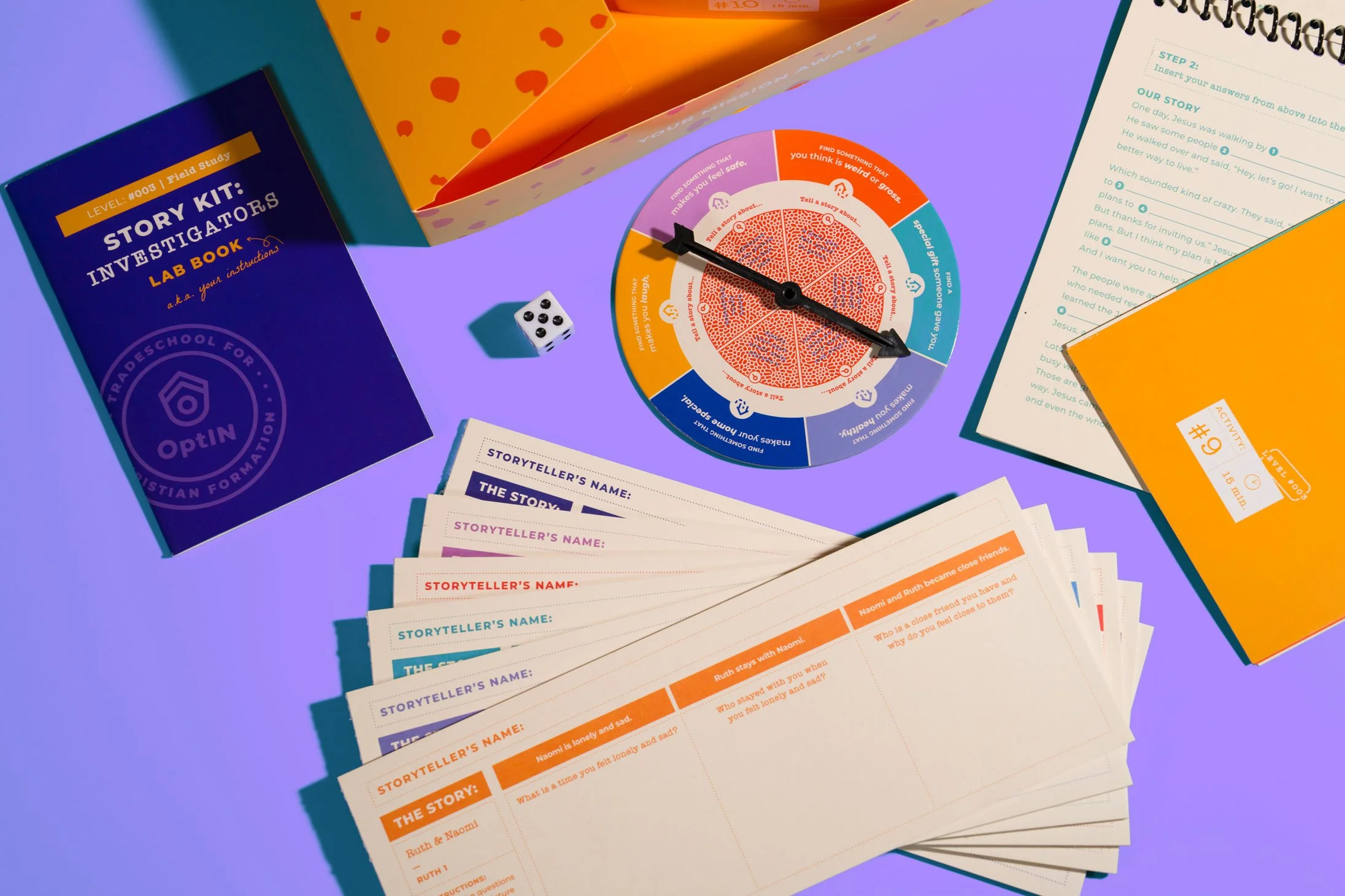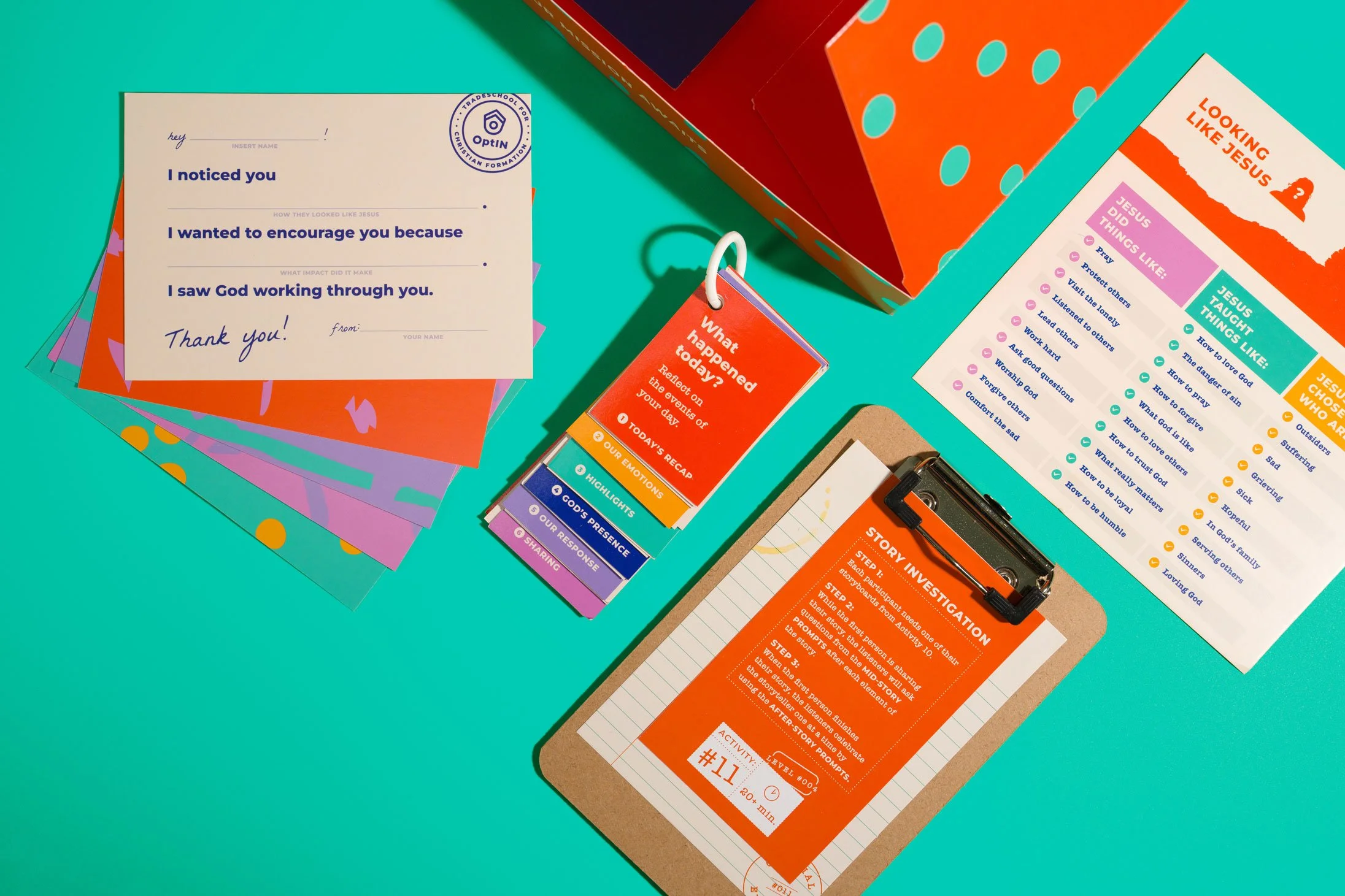A key brand element—the custom bird characters we previously developed for OptIN—was integrated throughout the kit, appearing in illustrations and activities to encourage play, storytelling, and connection to everyday life. To reinforce the “Investigator” theme, we developed unique tools such as a decoding lens, reporter notebooks, evidence tags, case files, and interview clipboards. Custom illustrations of Bible stories and characters further enriched the experience, making theological content engaging while prompting conversation and reflection.